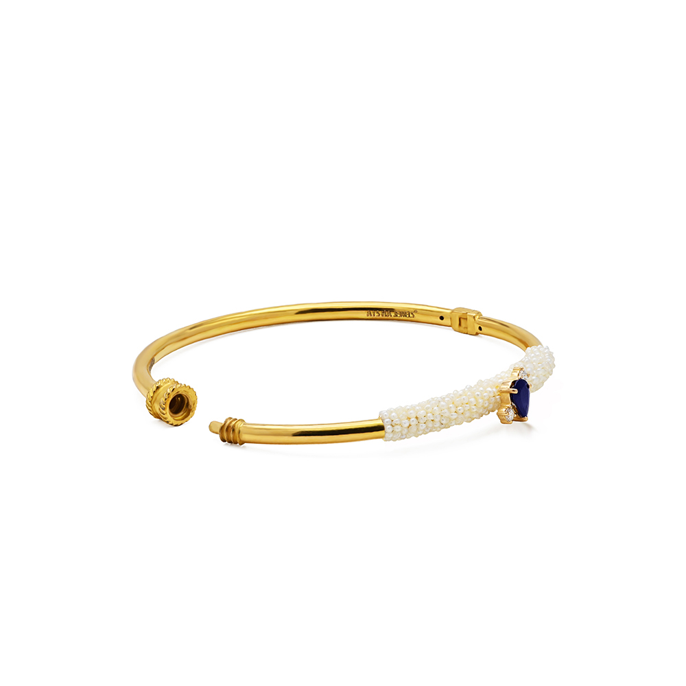 ذهب أصفر عيار 22 (8.275 جرام)، مرصع بالألماس درجة ڤي اس، اللون جي (0.07 قيراط)، سفاير أزرق (0.083 جرام)، ولؤلؤ بحريني طبيعي (0.881 جرام) تقريبًا.