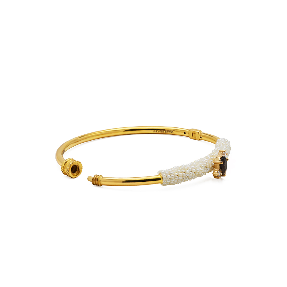 ذهب أصفر عيار 22 (8.275 جرام)، مرصع بالألماس درجة ڤي اس، اللون جي (0.07 قيراط)، كوارتز دخاني (0.083 جرام)، ولؤلؤ بحريني طبيعي (0.881 جرام) تقريبًا.