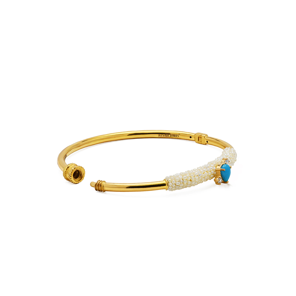 ذهب أصفر عيار 22 (8.275 جرام)، مرصع بالألماس درجة ڤي اس، اللون جي (0.07 قيراط)، فيروز (0.083 جرام)، ولؤلؤ بحريني طبيعي (0.881 جرام) تقريبًا.