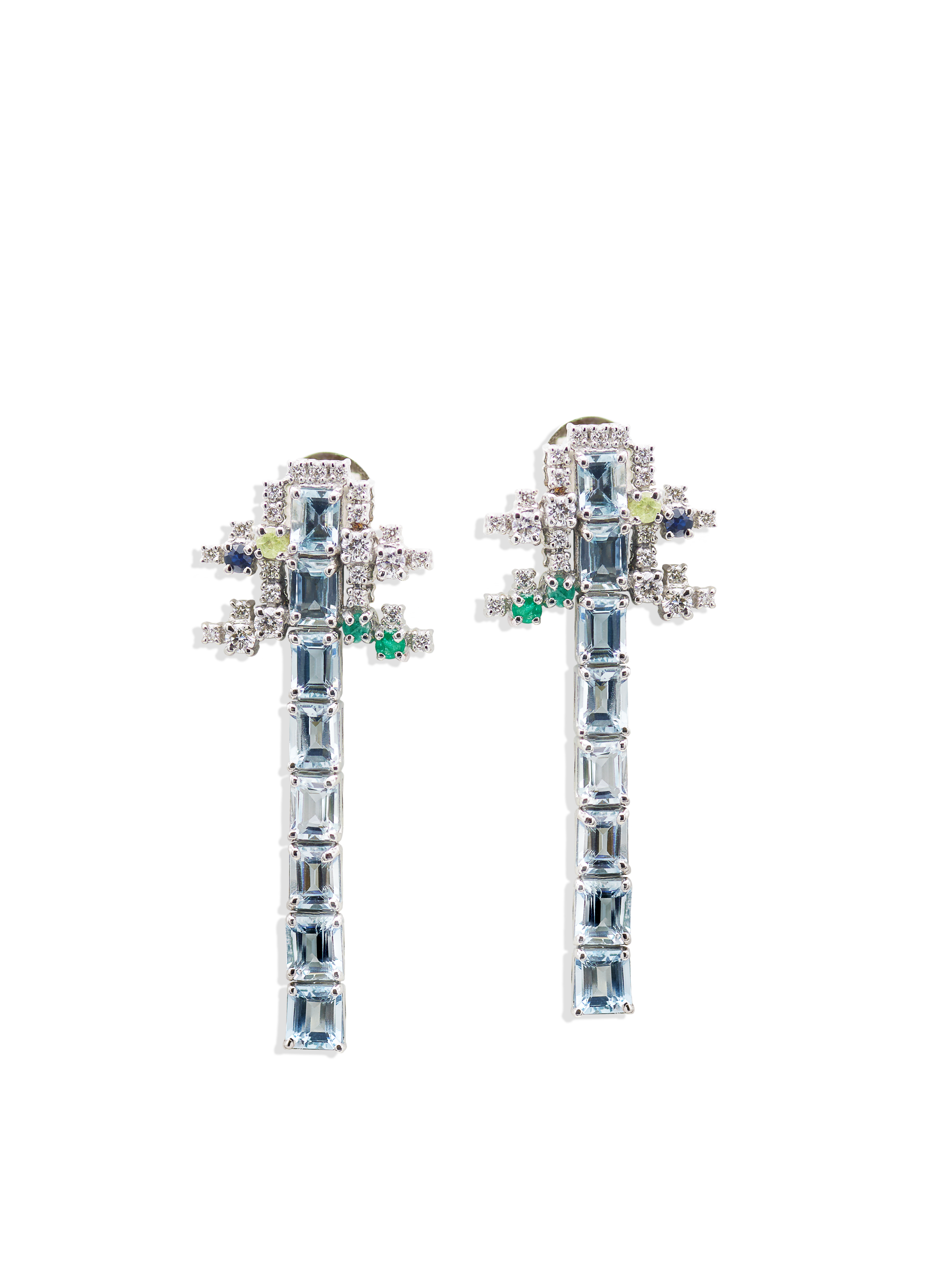 ذهب أبيض عيار 18 (12.07 جرام)، مرصع بالألماس درجة ڤي اس، اللون جي (4.76 قيراط)، واكوامارين (2.97 جرام) تقريبًا.