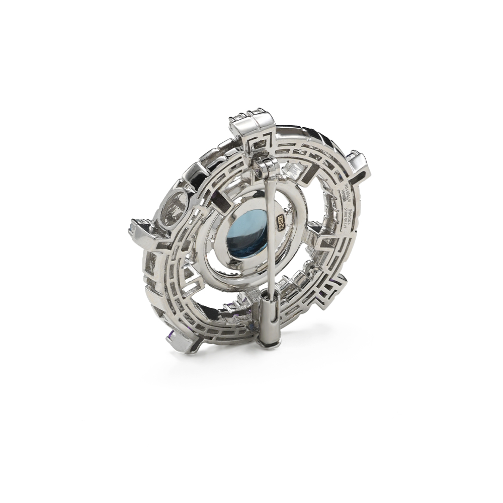 ذهب أبيض عيار 18 (21.856 جرام)، مرصع بالألماس درجة ڤي اس، اللون جي (1.14 قيراط)، والاحجار الكريمة (1.233 جرام) تقريبًا.