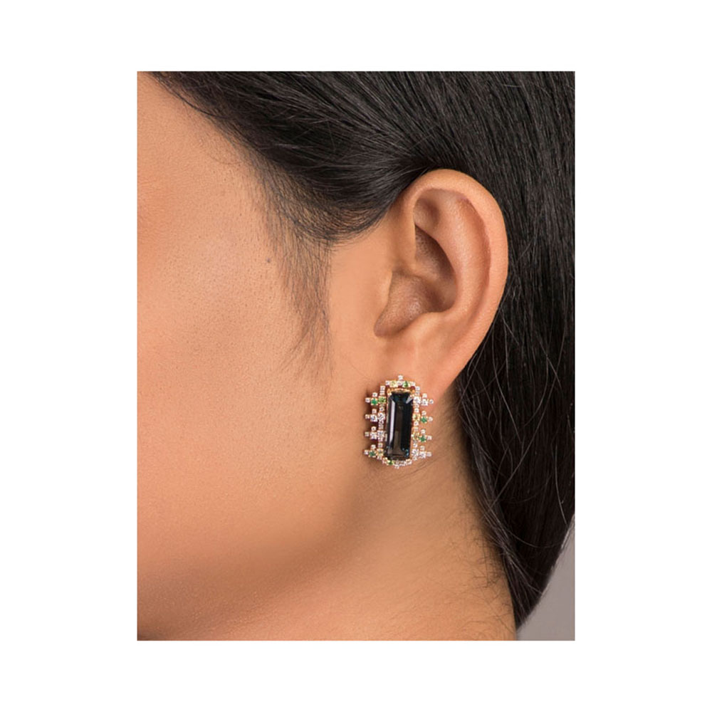 ذهب أصفر عيار 18 (11.74 جرام)، مرصع بالألماس درجة ڤي اس، اللون جي (4.455 قيراط)، وتوباز أزرق (2.968 جرام) تقريبًا.